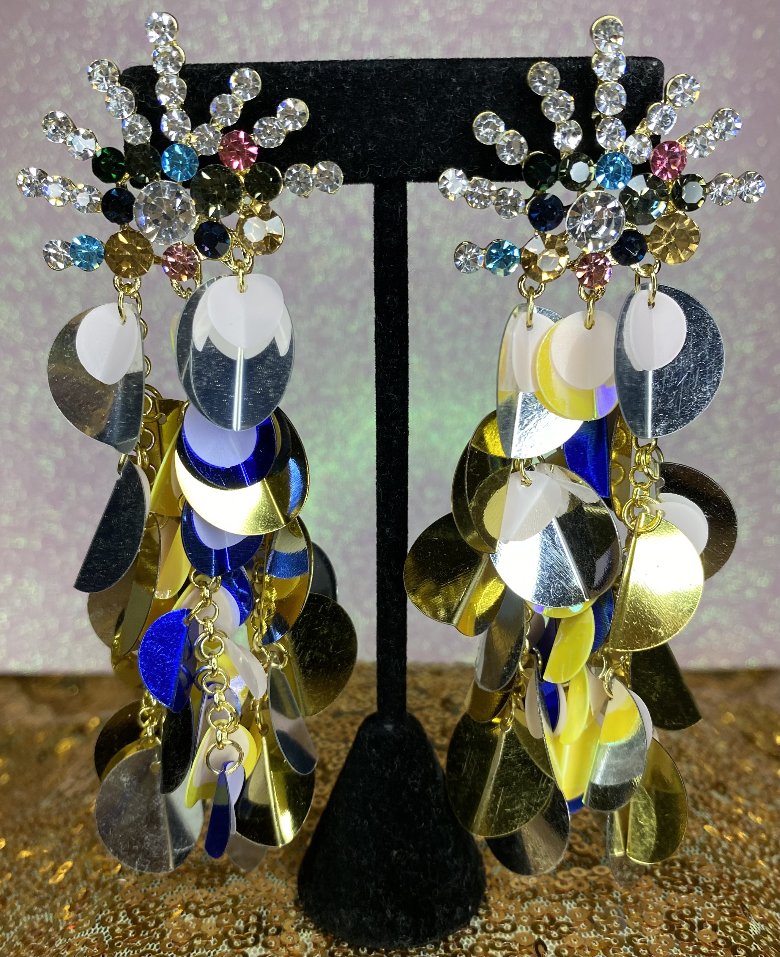 Crystal Multi-Color Spray with silver and gold metallic dangles. 4.5"