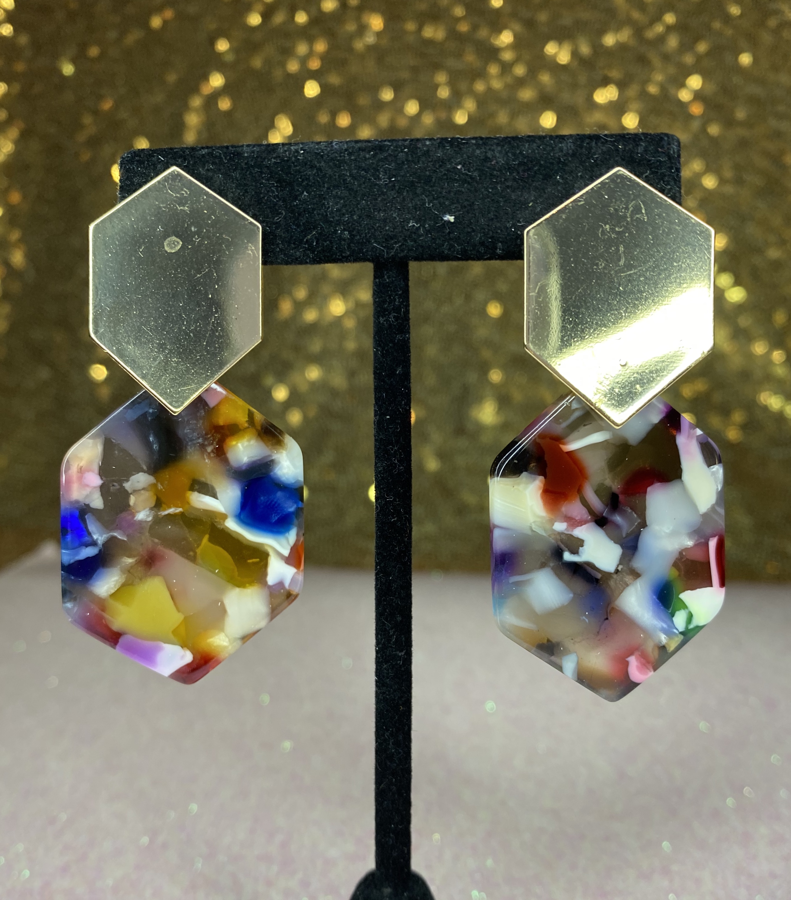 Hexagon shaped gold and water-colored enamel dangles. 2.5 in. drop