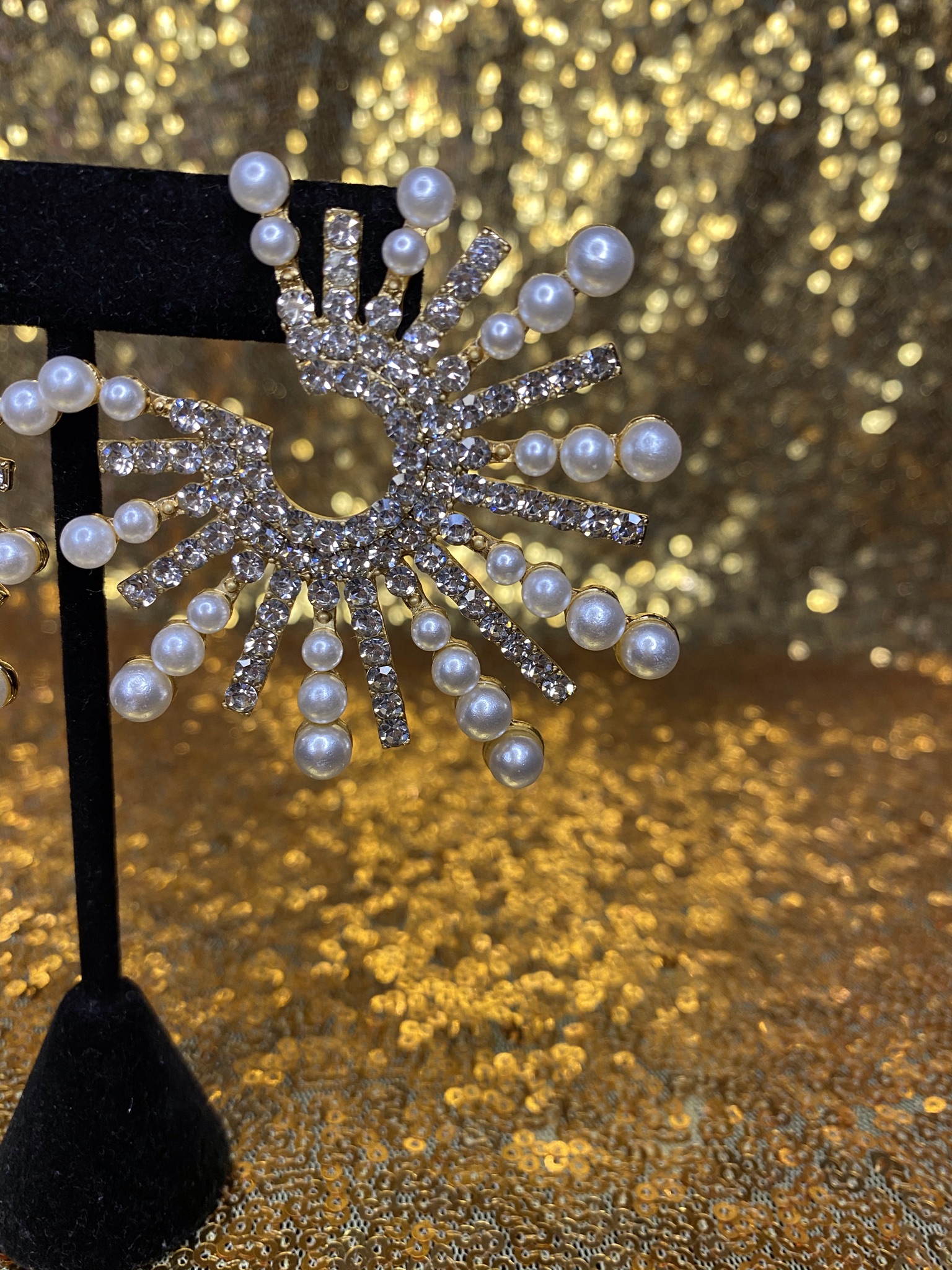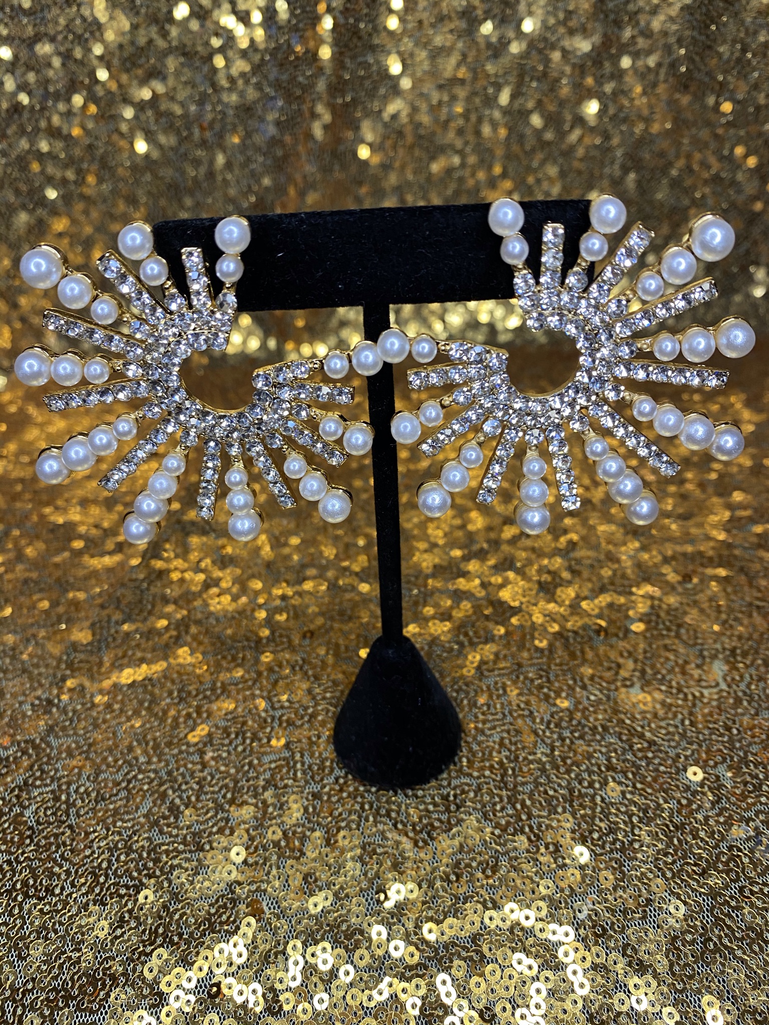 Gold, crystal and pearl statement earrings. Length- Approx. 3”