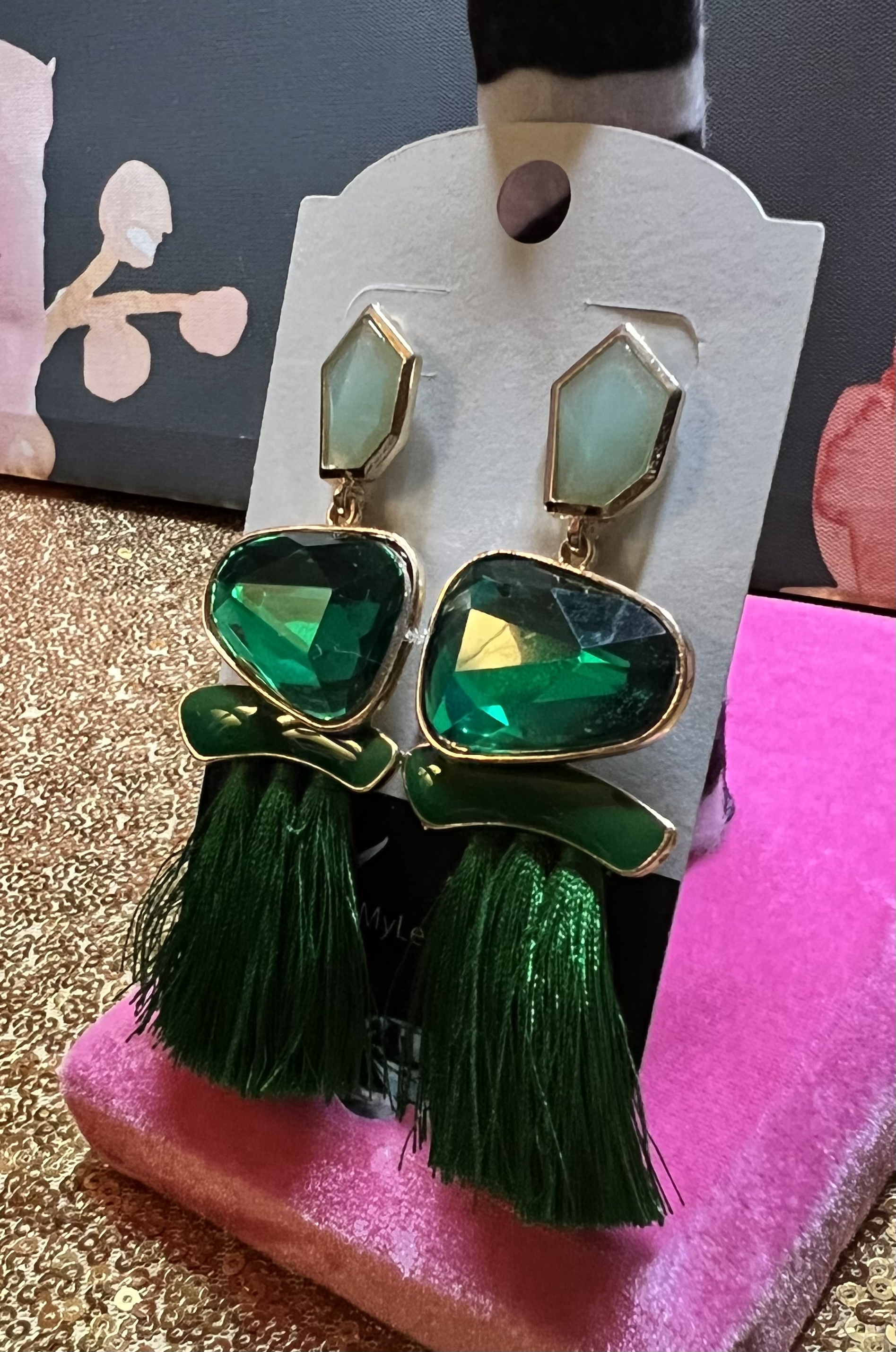 Stones of different shapes and shades of green set in gold with green fringe detail.