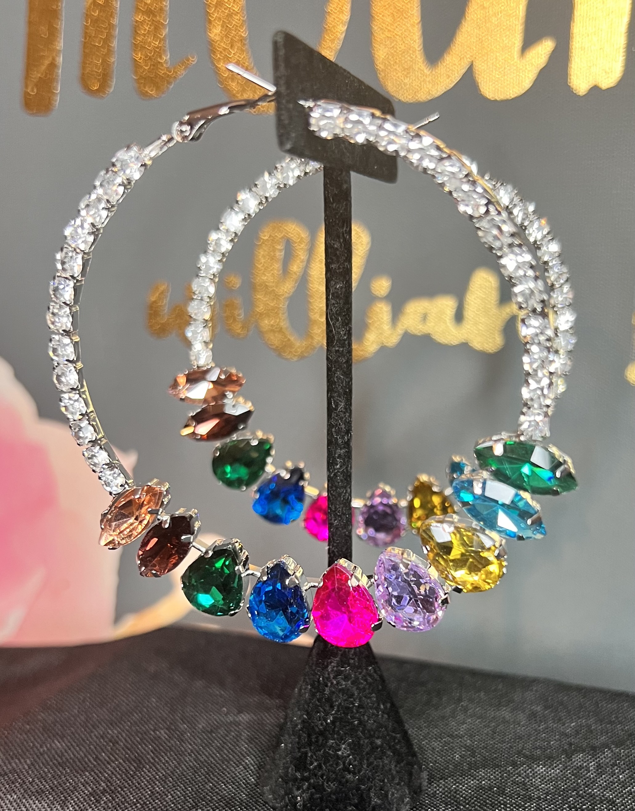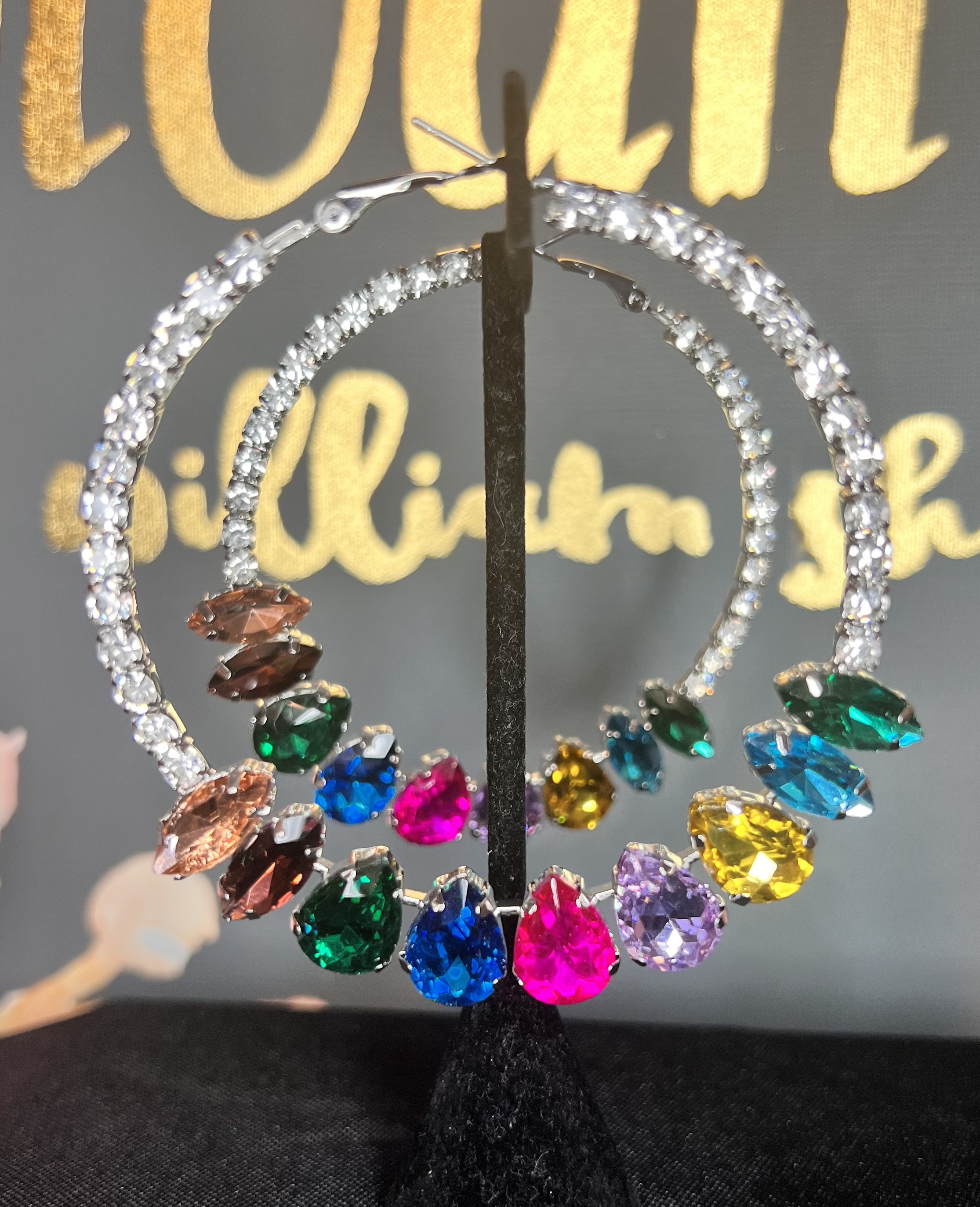 Silver Crystal Hoops with multi-colored pear-shaped gem stones.