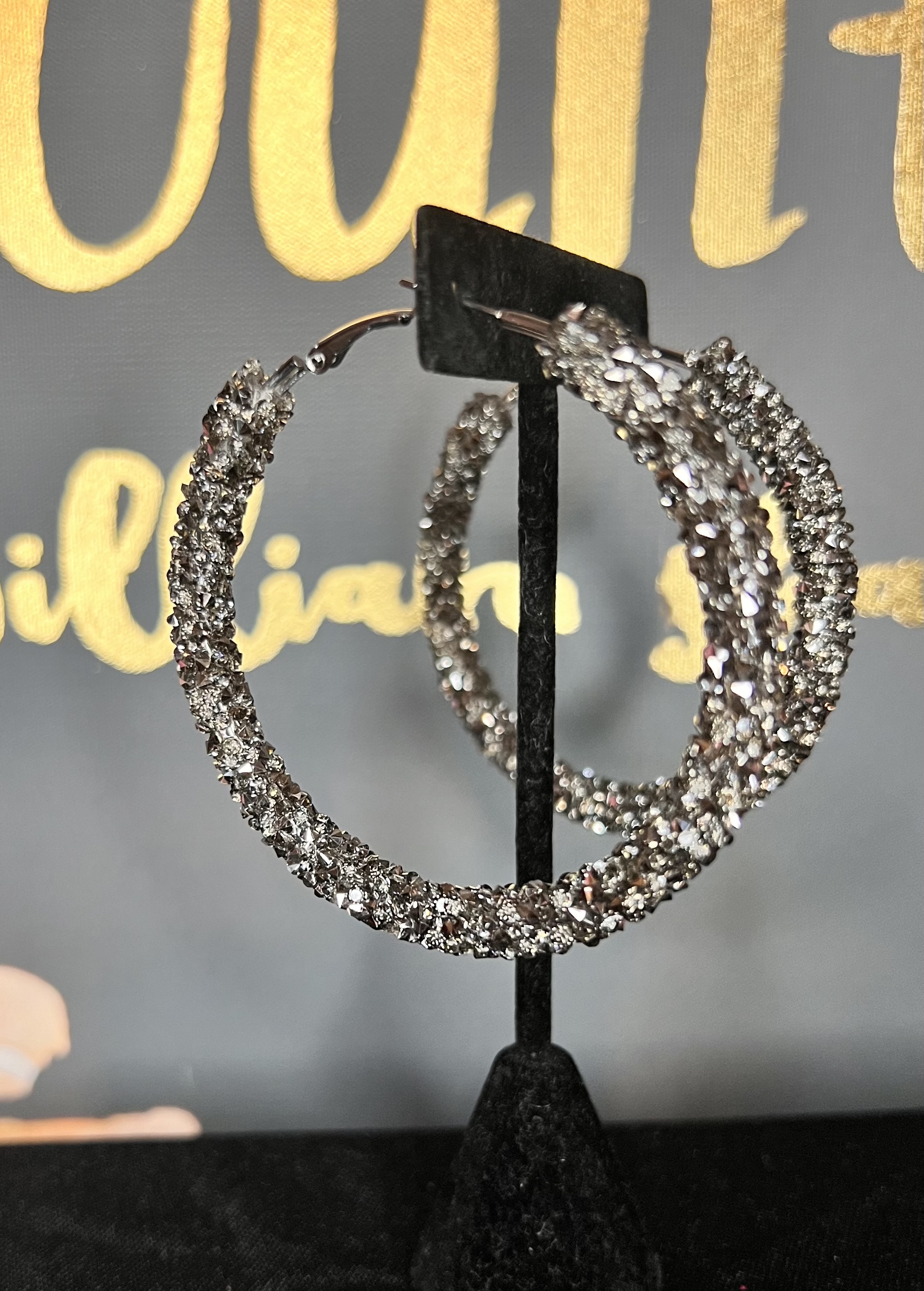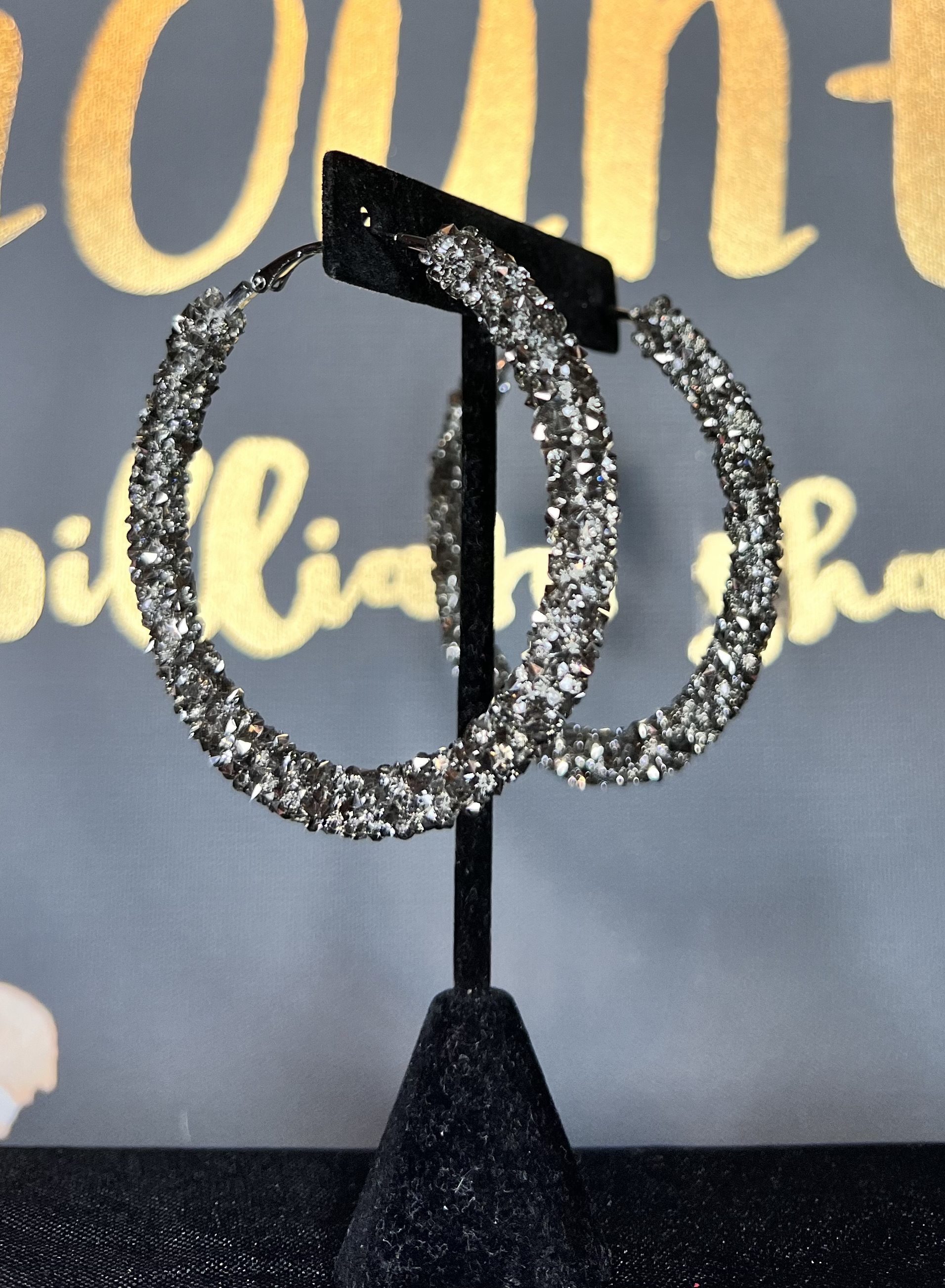 Gunmetal crystal hoops. Very lightweight. 3 in. drop