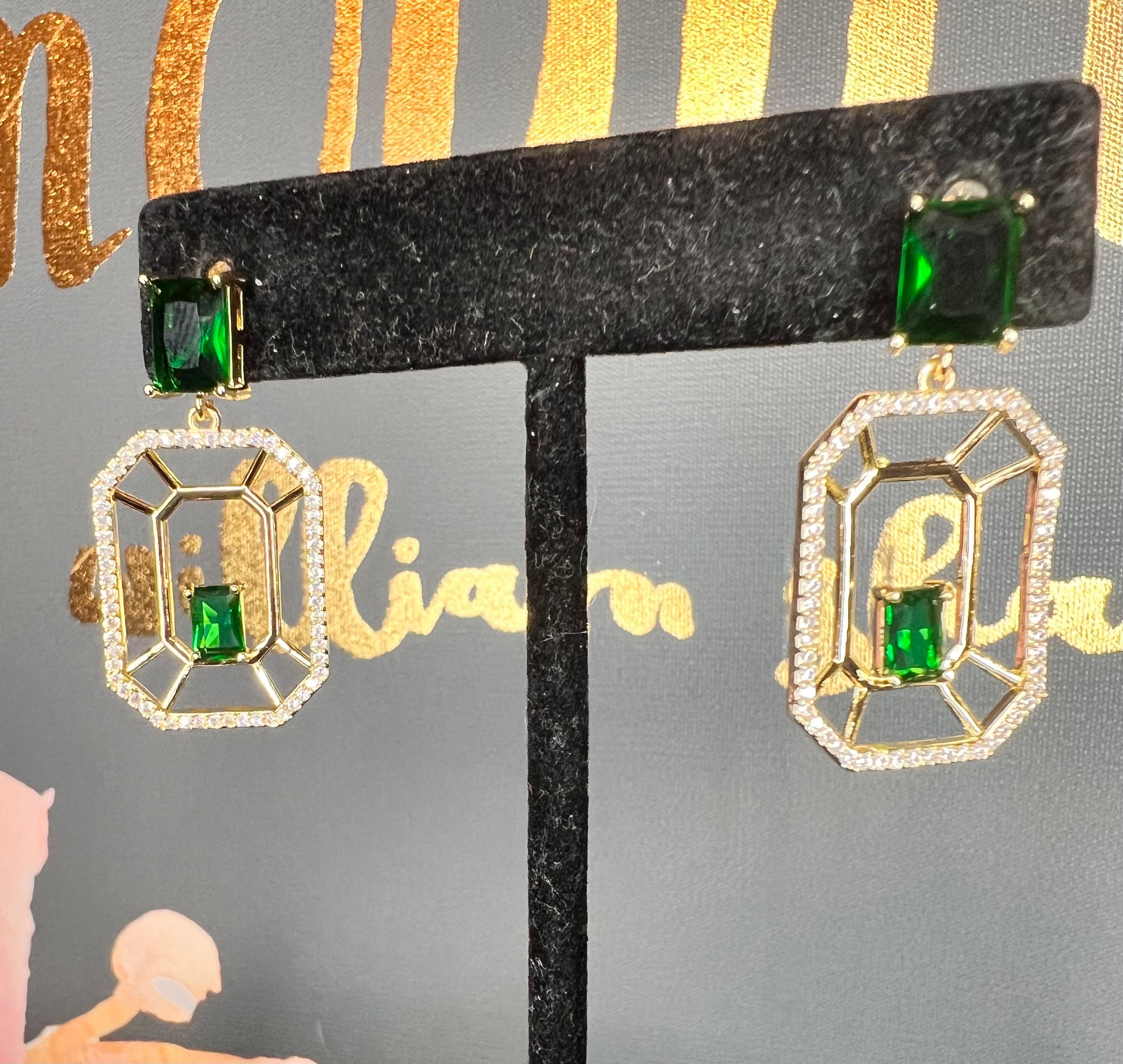 Octagon-shaped gold crystal dangle with emerald gemstones.